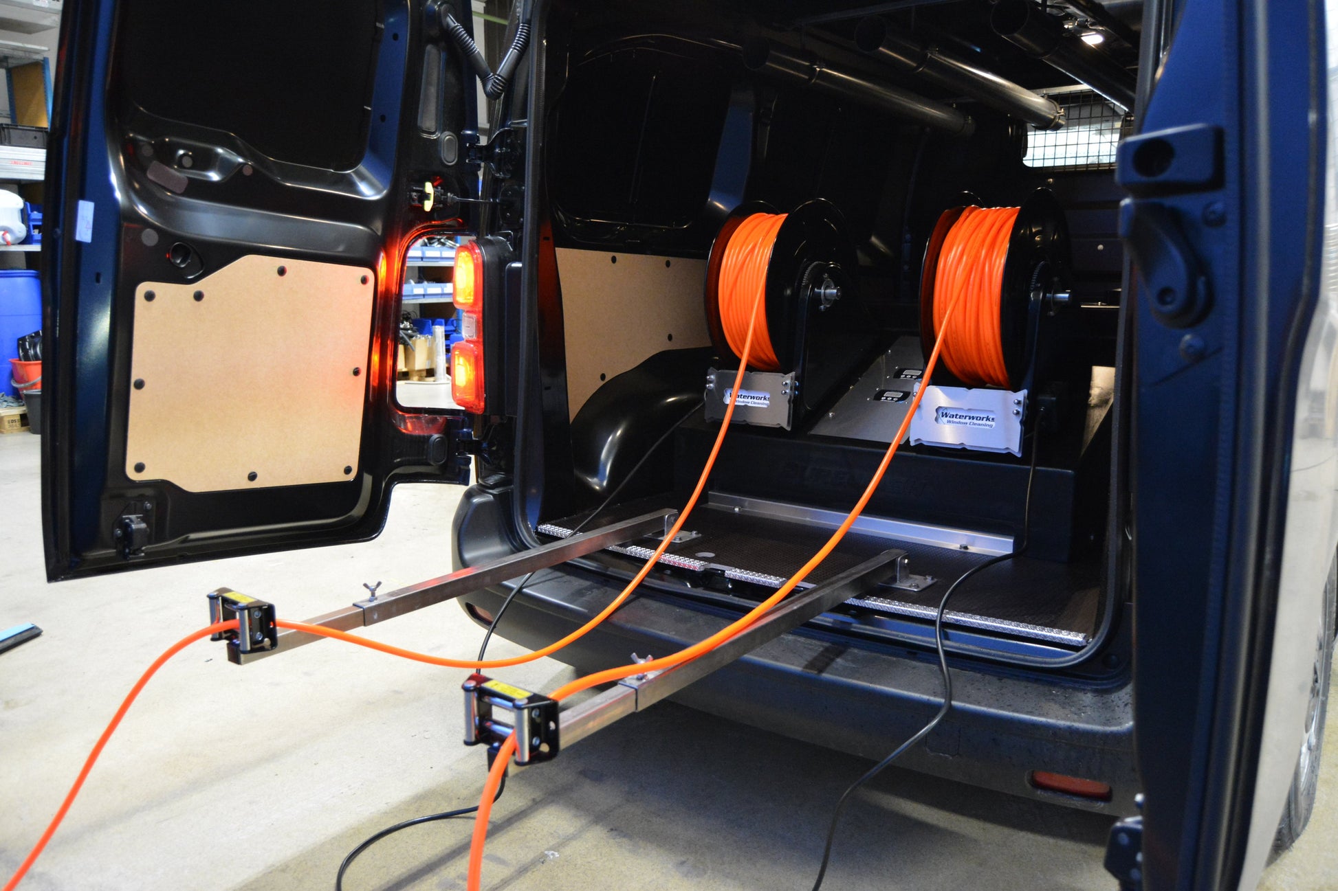 • 2 x Robust slangehjul med 100 Meter 8mm varmt-vandslange som kan opgraderes til elektrisk slangehjul samt til 8mm Legris blå varmt vandslange - Så kan der tilkobles varmt vand.