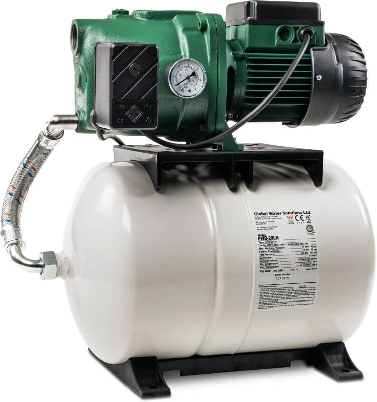 Booster-sæt bestående af en ekspansionsbeholder på 20 liter, pressostat til automatisk drift, trykmåler, selv-sugende elektropumpe komplet med strømkabel og stik, alt samlet og klar til installation.