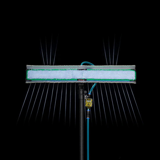 SOLAR ROCKER - Hemmeligheden i designet er, at vandet ikke passerer gennem denne børste som andre børster - det flyder hen over toppen af børstehårs bladene og fosser ned ad glasset, som om glasset er hydrofilt, selv om det er hydrofobt! Det betyder, at du har en større mængde skyllevand - hvilket sikrer, at alt snavs (selv edderkoppespind) nemt bliver skyllet af panelet uden at skulle "jages ned af glasset" som i gamle dage.