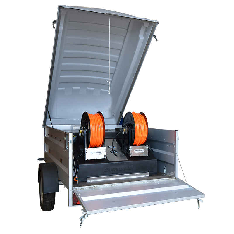 Denne trailer kan erhverves både med og uden RO Rentvandsproduktion, hvilket betyder at den kan tilpasses den enkelte bruger efter behov. Vaskeanlægget i traileren bliver leveret med en Digital flowcontroller og 100 mtr. 8 mm. Safety first vandslange, en 560 ltr. tank og vælg mellem elektrisk slangehjul tilkøb eller manuelt.