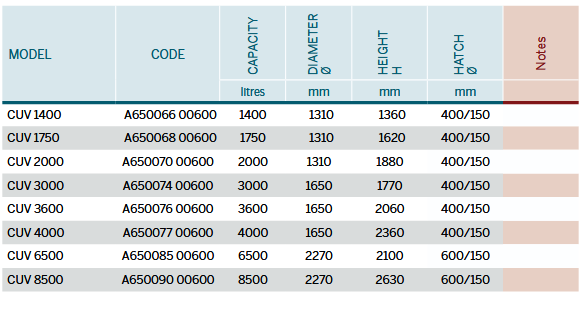 CUV - Vertikal cylinderformet vandtank fra 1.400 til 8.500 liter med mandehul, inspektionsluge 150mm og låg.